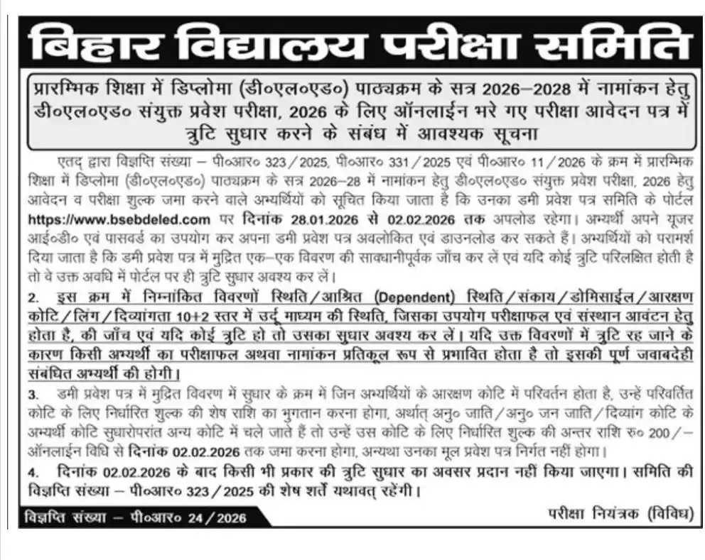 Bihar School Examination Board (BSEB) Patna has released the biharboardonline.bihar.gov.in BSEB Bihar DElEd Dummy Hall Ticket 2026 on 10 January 2026 for the BSEB Bihar DElEd Written Examination 2026. Follow these steps to check for the BSEB Bihar DElEd (Diploma in Elementary Education) Admission 2026 Dummy Admit Card Download Link.